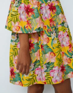 Tutti i colori della Polinesia in questo abito a balze in leggero cotone, un must-have per la Primavera Estate. La stampa floreale di ispirazione Hawaiana aggiunge un tocco di colore e di stile.