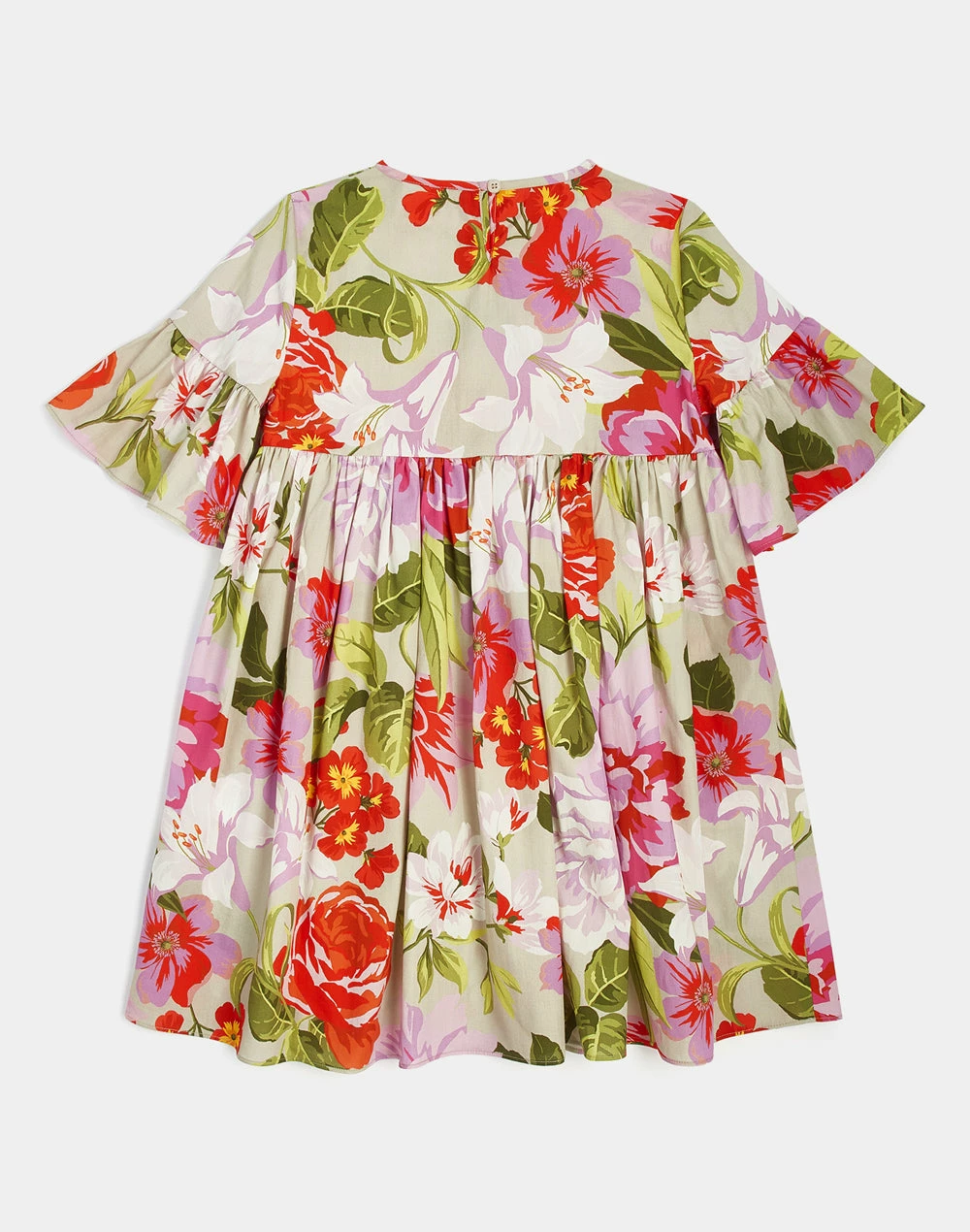 Abito a maniche corte da bambina con stampa amaranta, di ispirazione hawaiana. Fresco e leggero in cotone perfetto per l’estate.