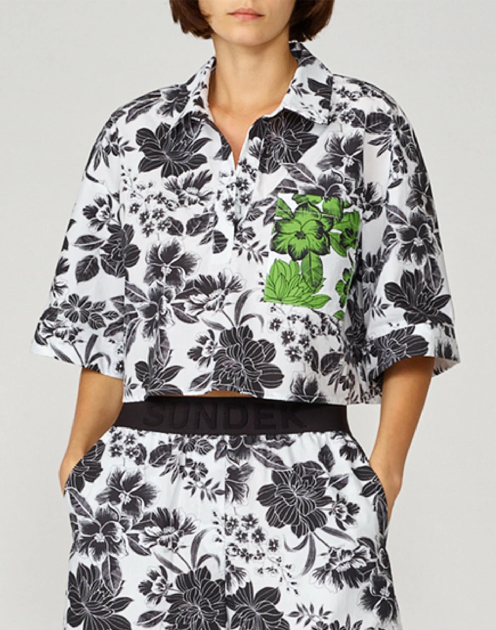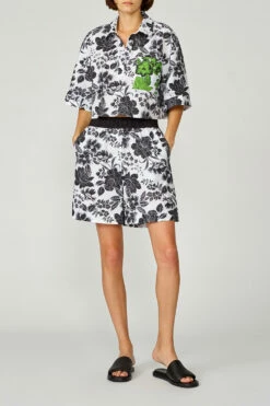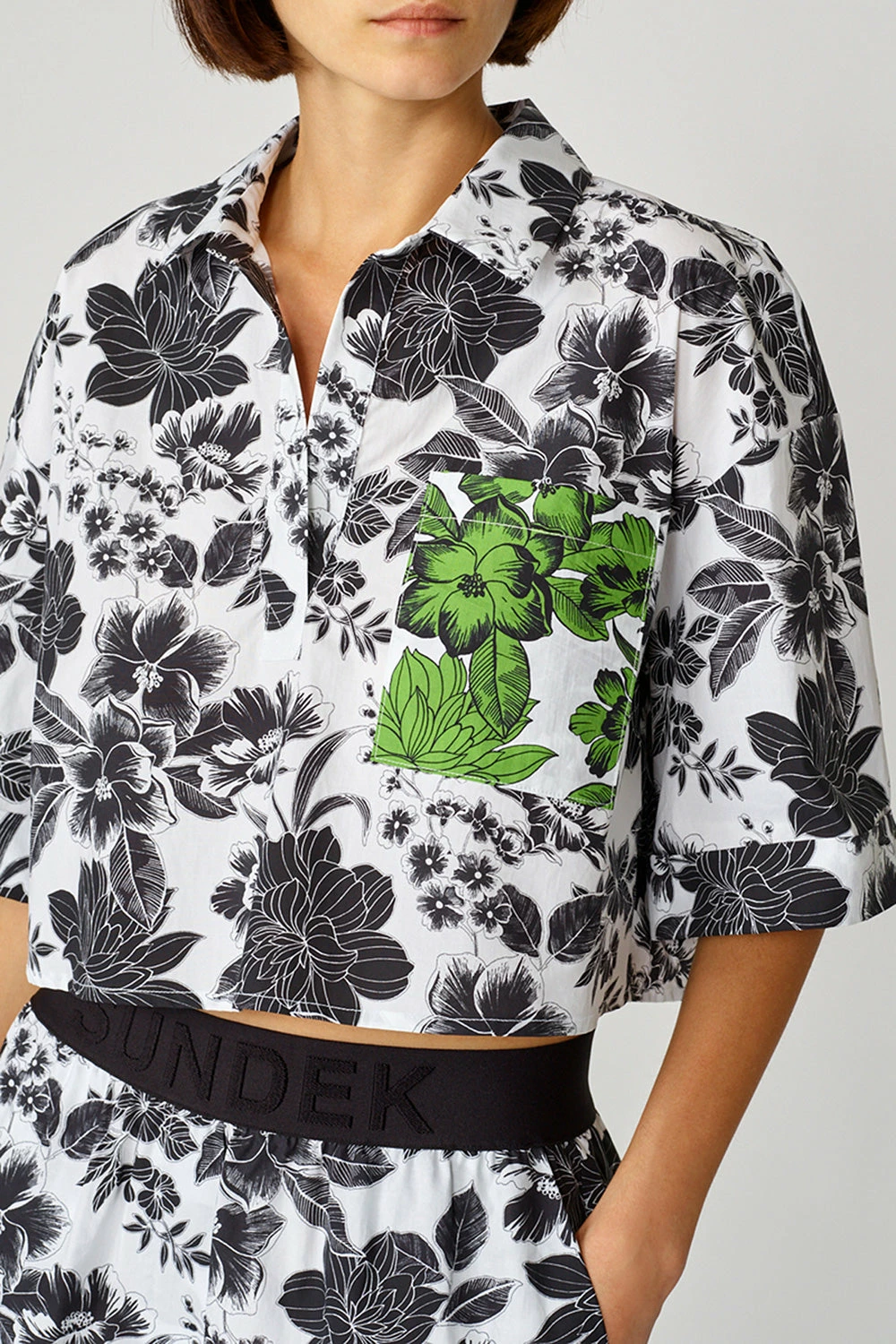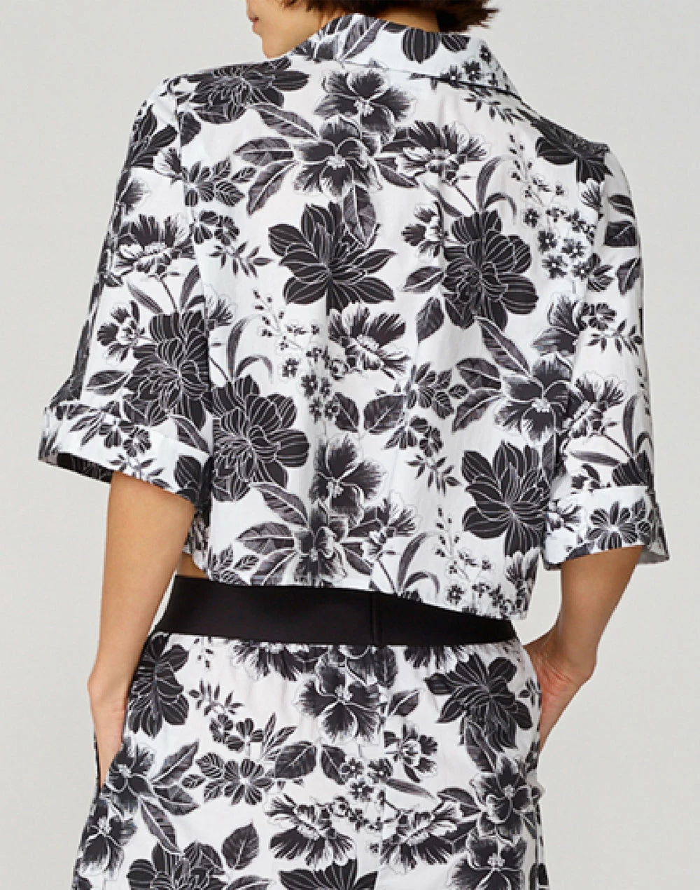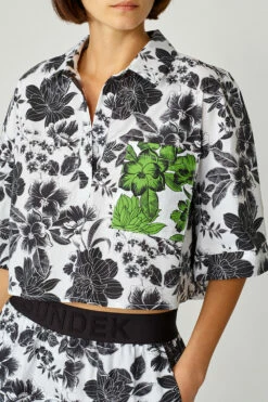 Un tocco di fantasia per completare il tuo stile. Scegli la blusa cropped in popeline di cotone con doppia stampa floreale all over. Linea morbida con maniche a 3/4 e collo con bottoni.