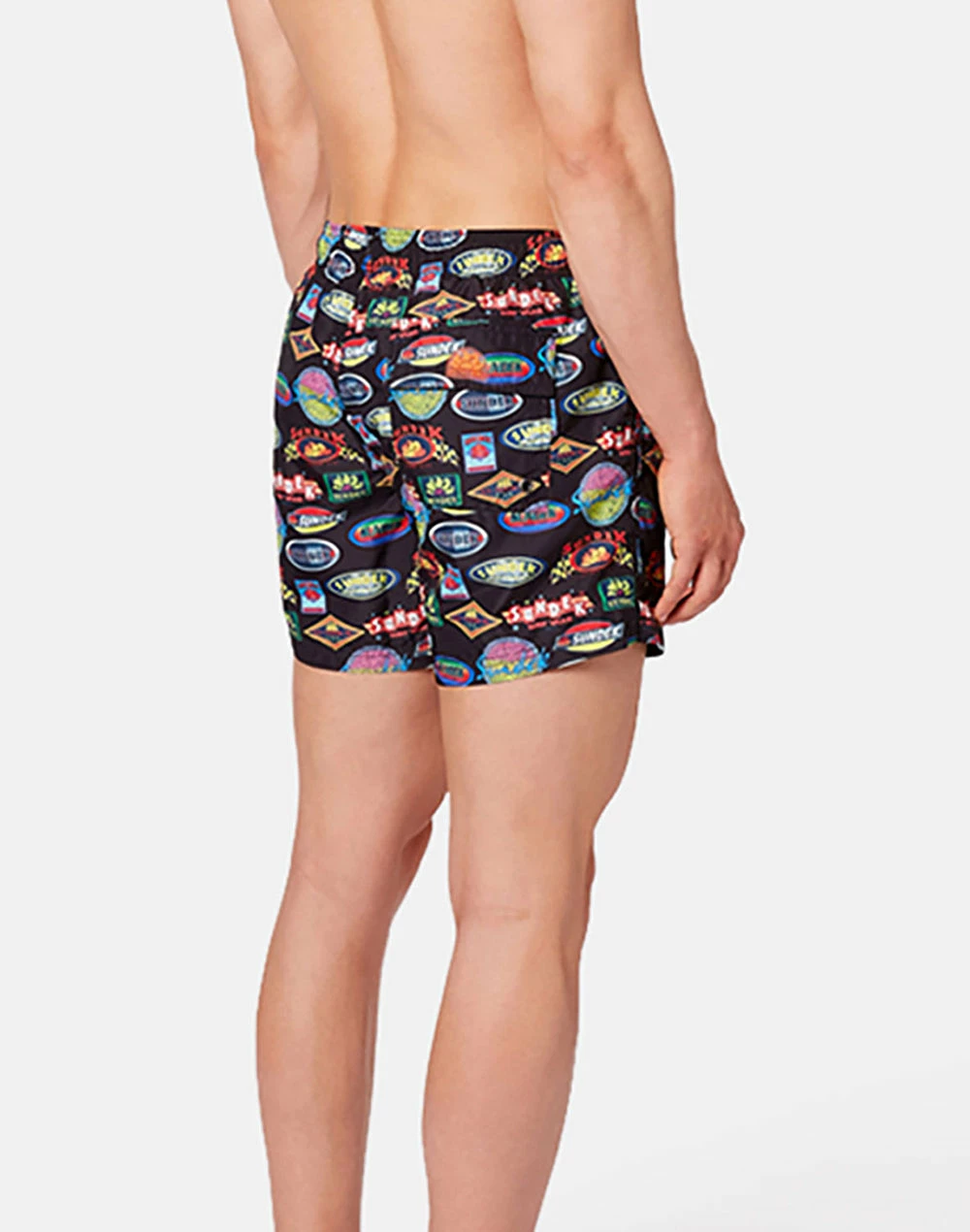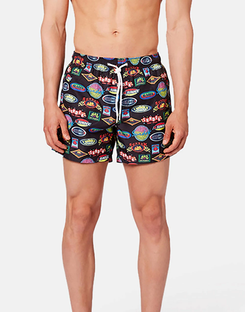 Dal nostro archivio storico, il costume corto in tessuto riciclato con stampa dei loghi Sundek.