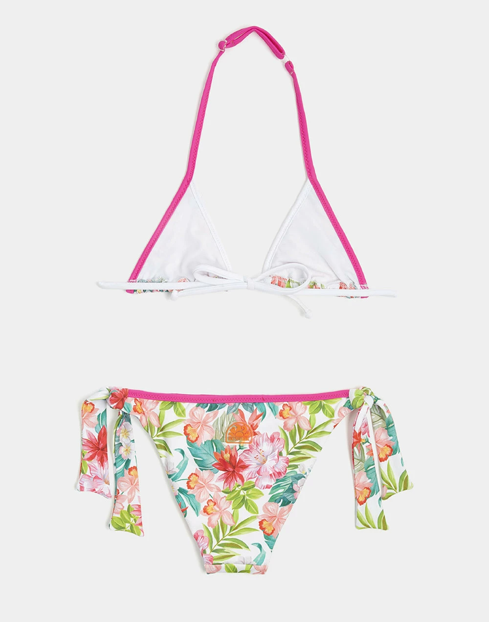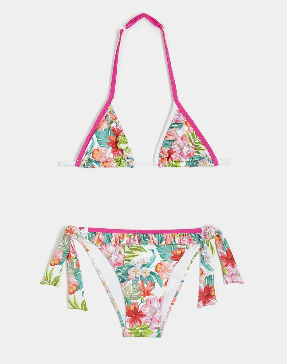 Colori brillanti e stampa fiorita di ispirazione hawaiana per questo bikini da bambina. Top con laccetti regolabili e slip con fiocchi regolabile ai fianchi.