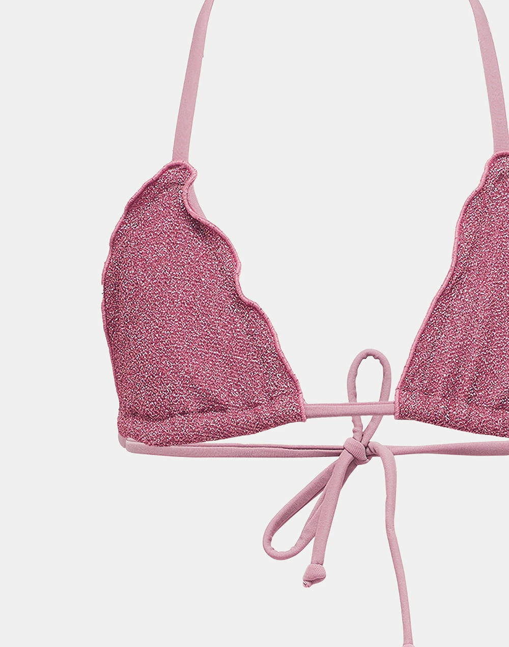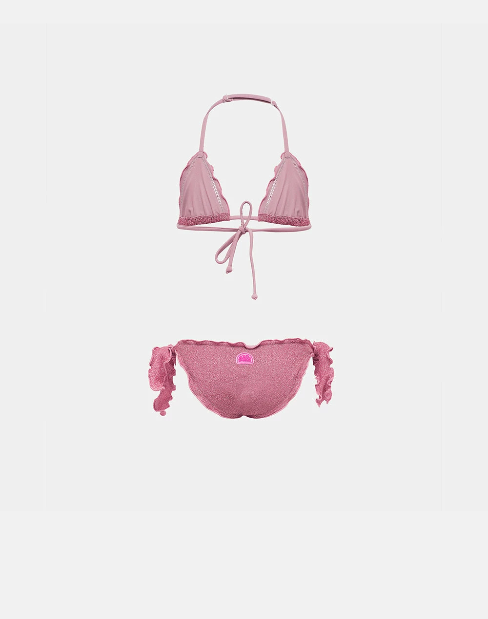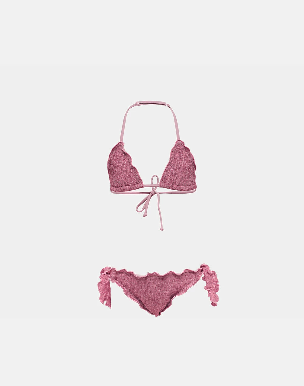 I profili a ruches e il tessuto in lurex donano un tocco speciale a questo bikini dalla vestibilità perfetta grazie al top con laccetti regolabili e allo slip con fiocchi ai fianchi. Perfetto per tutte le giornate piene di sole e mare.