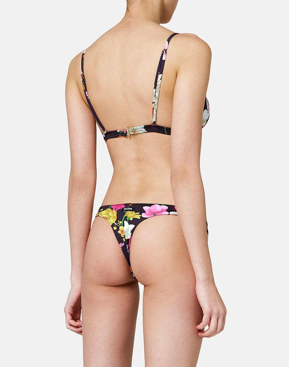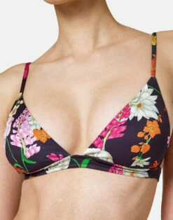 Stampa floreale multicolor e tessuto super morbido per questo top a triangolo con spalline sottili da regolare come vuoi.