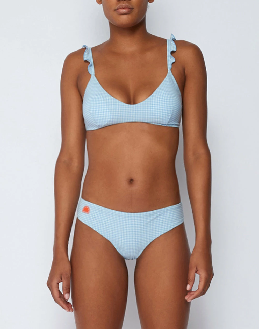 Completa il reggiseno in coordinato con questo slip culotte in vichy con arricciatura femminile sul retro. Sfoggerai un bikini da donna ricercato e perfetto sotto il sole.