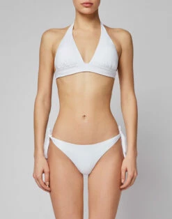 Tessuto doppiato leggero e confortevole per questi slip regolabili ai fianchi con laccetti da annodare e increspatura dietro. Da abbinare al top in coordinato.