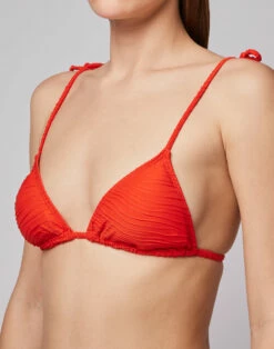 Originale e ricercato questo bikini top in lycra testurizzata presenta un particolare effetto onda a livello del tessuto, quasi un arricciatura. Le spalline sono regolabili. Sul retro invece la chiusura è con placca metallica.