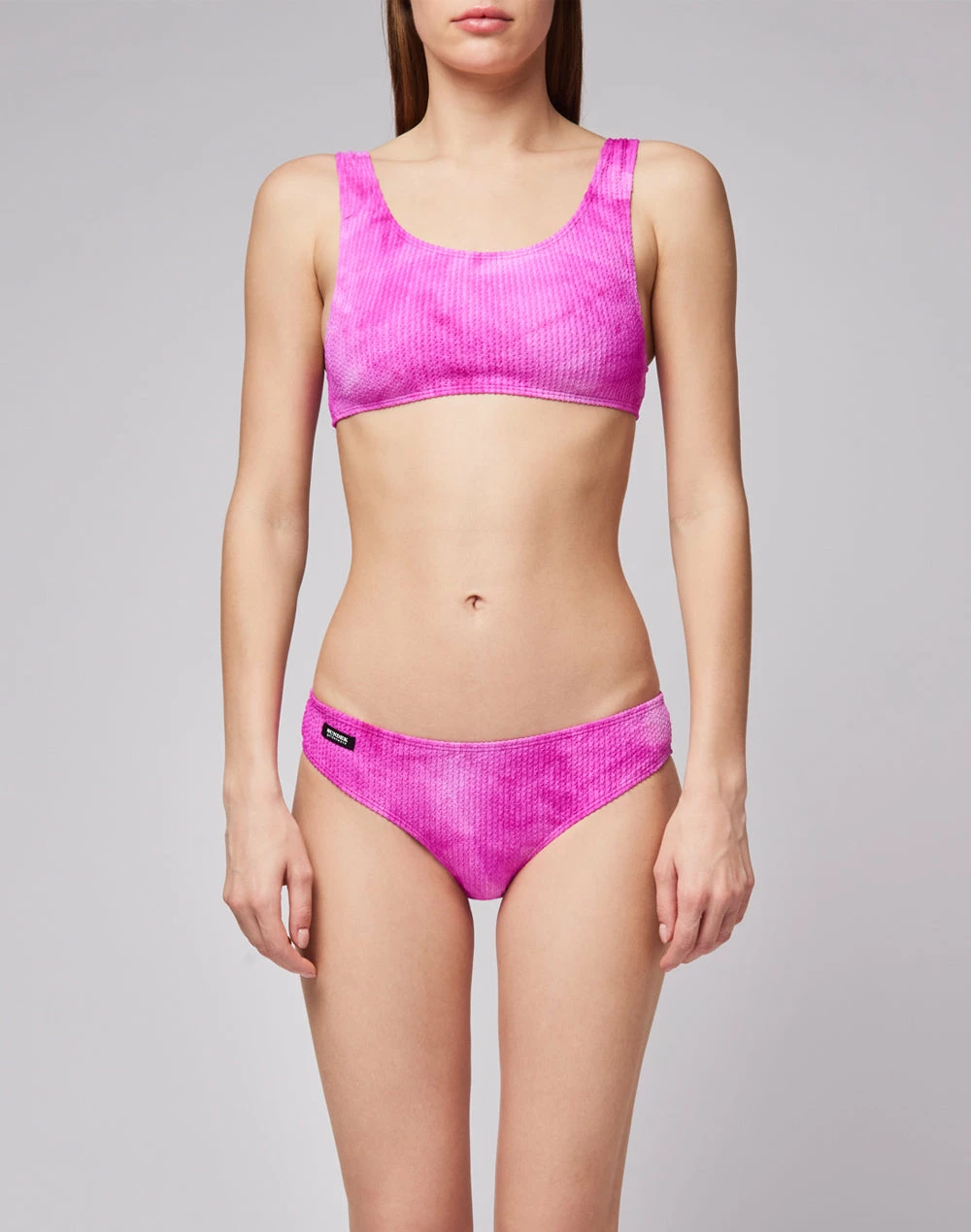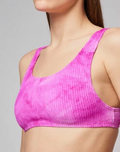 Top in lycra jacquard con lavorazione Tye Dye texturizzata. Vestibilità sporty. Da abbinare allo slip in coordinato per un completo mare originale.