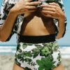 Top triangolo piquet con lacci regolabili e fantasia tropic zebra. Slip in coordinato venduto separatamente.